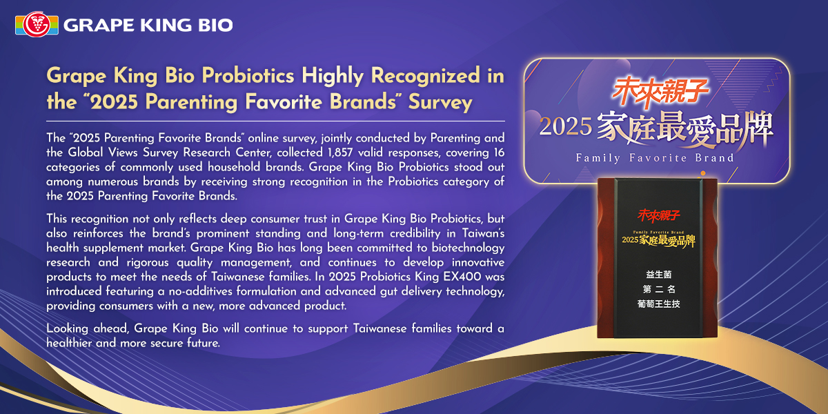 This recognition not only reflects deep consumer trust in Grape King Bio Probiotics, but also reinforces the brand’s prominent standing and long-term credibility in Taiwan’s health supplement market. Grape King Bio has long been committed to biotechnology research and rigorous quality management, and continues to develop innovative products to meet the needs of Taiwanese families. In 2025 Probiotics King EX400 was introduced featuring a no-additives formulation and advanced gut delivery technology, providing consumers with a new, more advanced product.